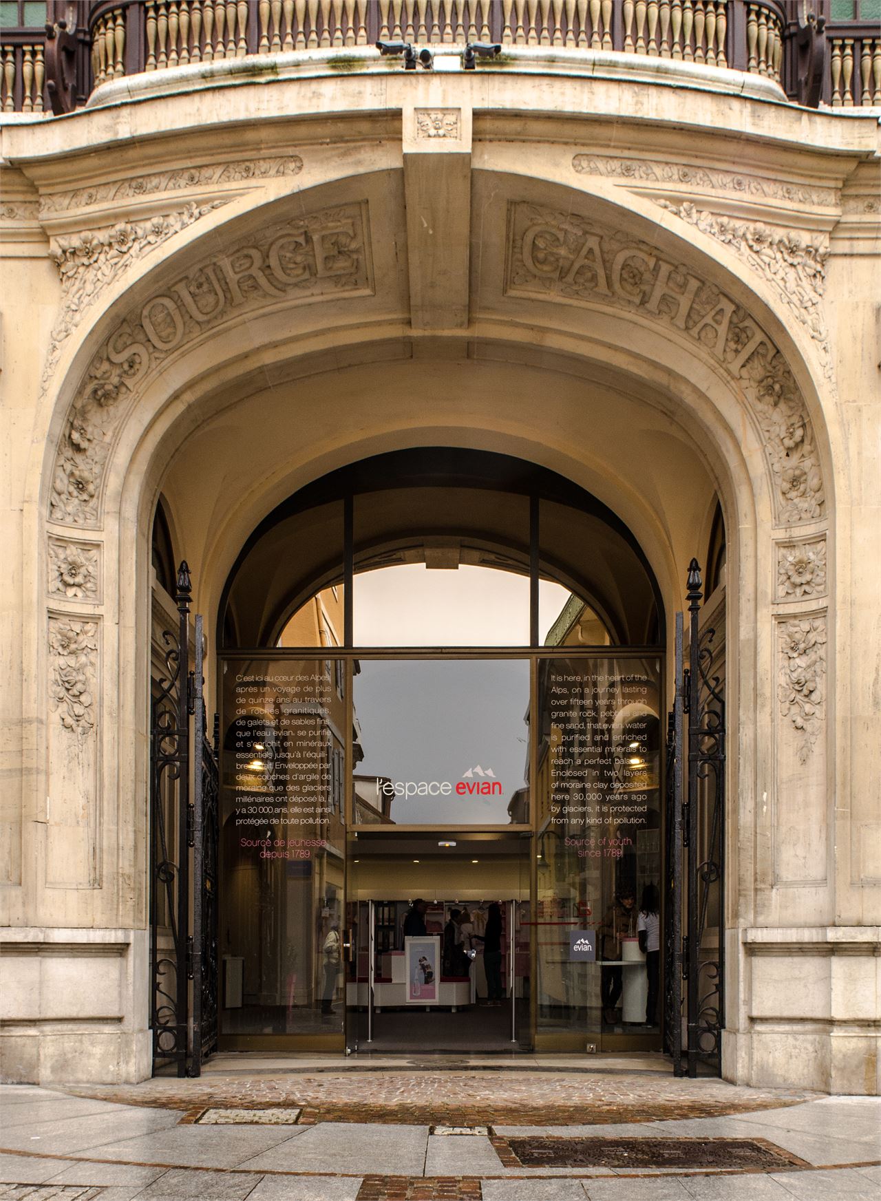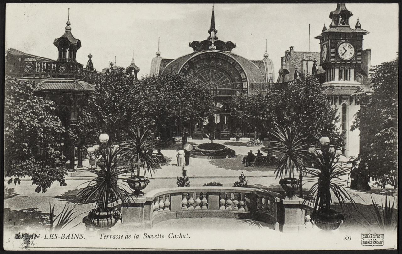 It is on the site of the Sainte-Catherine de la Touvière church, demolished at the end of the 18th century, that a bathing establishment was built in 1826 using water from the Cachat spring. It is modified several times to adapt it to the growing number of people taking the waters and to the evolution of care. In 1905, the Société des eaux minérales (Mineral Water Company) replaced it with this refreshment bar, the centre of the resort's social life. Designed by the architect Albert Hébrard, it is a masterpiece of Art Nouveau, all curves and counter-curves, whose monumental entrance overlooks the Rue Nationale. The roof structure of the large hall, decorated with stained-glass windows with floral motifs and covered with glazed tiles, is listed as a Historic Monument. It houses a graceful statue by the sculptor Charles Beylard, "Apotheosis of the Cachat spring", a recent copy of which is in front of the spring.